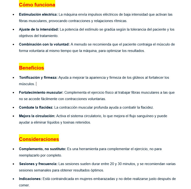 La máquina envía impulsos eléctricos de baja intensidad que activan las fibras musculares, provocando contracciones y relajaciones rítmicas.